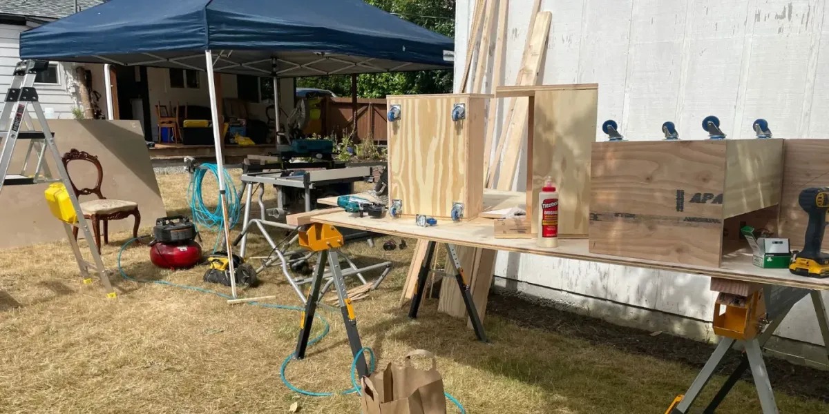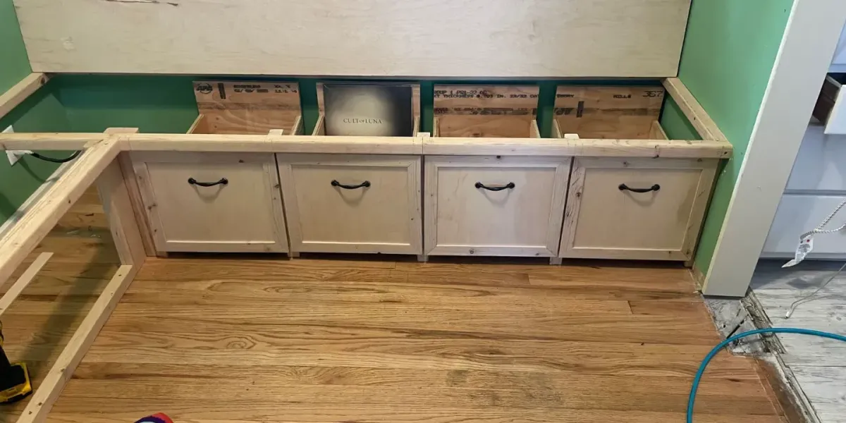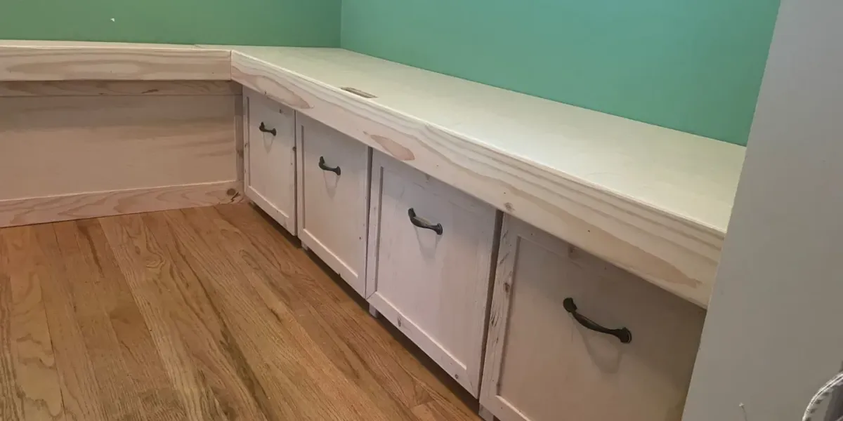 This project involved designing and constructing a custom corner bench with integrated storage. The build started with a solid wood frame for structural support, followed by the fabrication of individual storage compartments fitted with custom front panels and handles. Each bench section was stained for a warm finish and topped with cushioned seating for added comfort. The result is a highly functional piece that maximizes space while adding a clean, built-in look perfectly suited for the room.